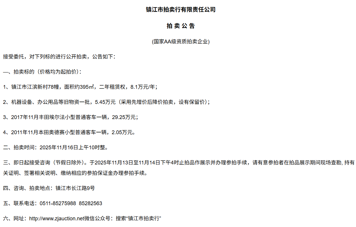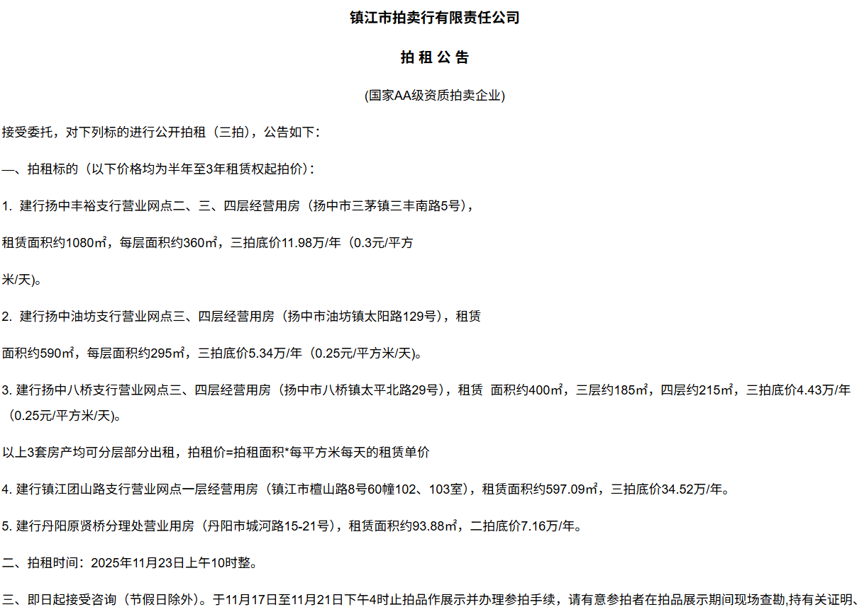 鎮江市拍賣行有限責任公司拍 租 公 吿(國家AA級資質拍賣企業)接受委托,對下列標的進行公開拍租(三拍),公告如下:—、拍租標的(以下價格均為半年至3年租賃權起拍價):1.  建行揚中豐裕支行營業網點二、三、四層經營用房(揚中市三茅鎮三豐南路5號),租賃面積約1080㎡,每層面積約360㎡,三拍底價11.98萬/年(0.3元/平方米/天)。2.  建行揚中油坊支行營業網點三、四層經營用房(揚中市油坊鎮太陽路129號),租賃面積約590㎡,每層面積約295㎡,三拍底價5.34萬/年(0.25元/平方米/天)。3. 建行揚中八橋支行營業網點三、四層經營用房(揚中市八橋鎮太平北路29號),租賃  面積約400㎡,三層約185㎡,四層約215㎡,三拍底價4.43萬/年(0.25元/平方米/天)。以上3套房產均可分層部分出租,拍租價=拍租面積*每平方米每天的租賃單價4. 建行鎮江團山路支行營業網點一層經營用房(鎮江市檀山路8號60幢102、103室),租賃面積約597.09㎡,三拍底價34.52萬/年。5. 建行丹陽原賢橋分理處營業用房(丹陽市城河路15-21號),租賃面積約93.88㎡,二拍底價7.16萬/年。二、拍租時間:2025年11月23日上午10時整。三、即日起接受咨詢(節假日除外)。于11月17日至11月21日下午4時止拍品作展示并辦理參拍手續,請有意參拍者在拍品展示期間現場查勘,持有關證明、簽署相關說明、繳納相應的參拍保證金辦理參拍手續。四、咨詢、拍租地點:鎮江市長江路9號五、聯系方式:0511-85275988   13655299933楊先生六、網址:http://www_zjauction_net.argentagreenhouse.com;微信公眾號:搜索“鎮江市拍賣行” 拍品清單2025.11.23序號名稱起拍價(元)標的說明1建行揚中豐裕支行營業網點二、三、四層經營用房(揚中市三茅鎮三豐南路5號),租賃面積約1080㎡,每層面積約360㎡三拍底價11.98萬/年(0.3元/平方米/天)1、1-3號房產均可分層部分出租,拍租價=拍租面積*每平方米每天的租賃單價;2、意向競拍人在拍賣前需持營業執照或身份證與委托方說明租賃房產經營業態,確定意向后出具房產承租用途承諾書,經委托方審核后,方可交納保證金參加競拍;3、租賃期限為半年至3年(承租方與出租方協商而定),承租方每半年或一年結付租金,租賃期間的水、電費用及其它相關費用均由承租方承擔;4、承租方不得用于經營和保管危險物品,不得用于開設餐飲、娛樂等可能嚴重影響消防安全、運營安全的經營業態,不得用于經營委托貸款、小額貸款等可能冒用委托方名義,帶來聲譽風險的經營業態。租賃期內,承租方不得破壞墻體結構,自行成就消防、安全等使用條件,不得擅自將租賃房屋轉租、轉讓給他人使用,否則委托方有權收回房屋;5、拍租成交后,承租方將租金交至出租方指定賬戶,傭金交至拍賣方賬戶(拍租傭金為該房屋一個月租金)。承租方憑租賃合同無息退還保證金。2建行揚中油坊支行營業網點三、四層經營用房(揚中市油坊鎮太陽路129號),租賃面積約590㎡,每層面積約295㎡三拍底價5.34萬/年(0.25元/平方米/天)3建行揚中八橋支行營業網點三、四層經營用房(揚中市八橋鎮太平北路29號),租賃面積約490㎡,每層面積約245㎡三拍底價4.43萬/年(0.25元/平方米/天)4建行鎮江團山路支行營業網點一層經營用房(鎮江市檀山路8號60幢102、103室),建筑面積約597.09㎡三拍底價34.52萬/年5建行丹陽原賢橋分理處營業用房(丹陽市城河路15-21號),建筑面積約93.88㎡二拍底價7.16萬/年